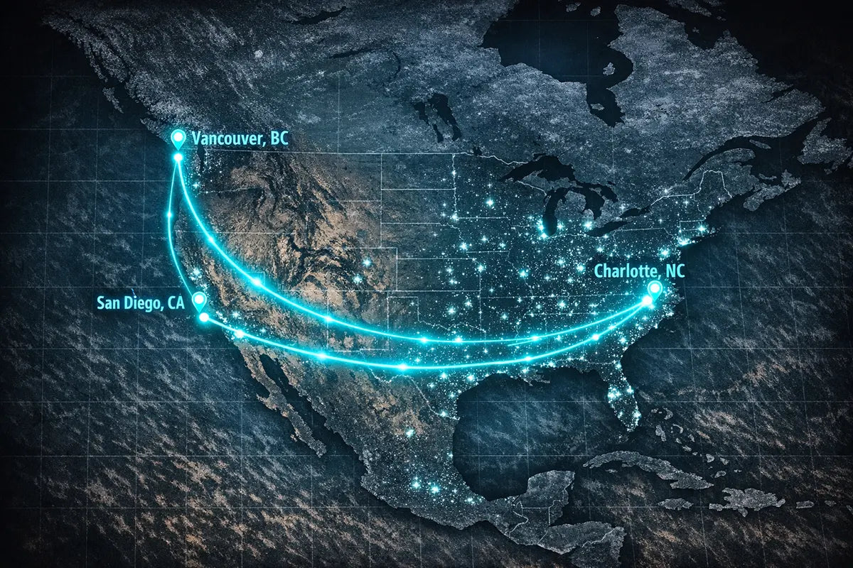 The Breakthrough Network spans three critical nodes: Vancouver, San Diego, and Charlotte. This allows us to offer true bi-coastal US distribution while maintaining a strategic Canadian hub for inbound inventory and duty deferral.